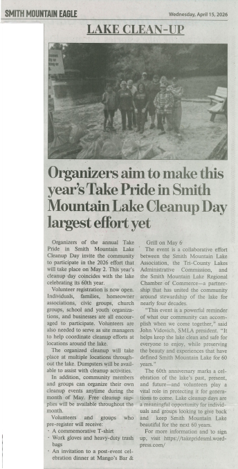 Organizers aim to make this year’s Take Pride in Smith Mountain Lake Annual Cleanup the largest effort yet Apr 16, 2026 This years event coincides with the lake celebrating its 60th year!